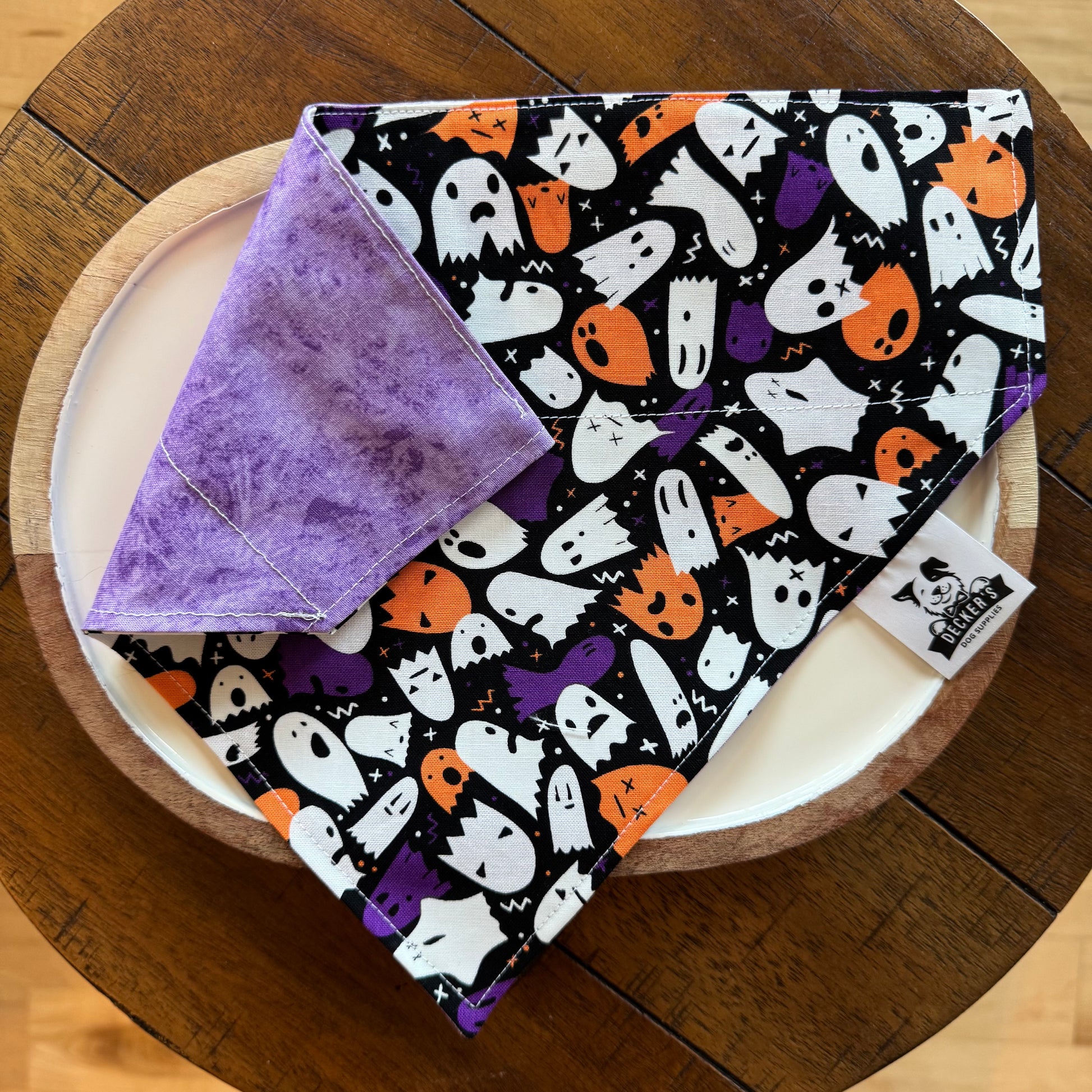 Assorted Ghosts and Ghouls in Halloween colors over a black backdrop on the front and a simple purple backside. It also glows in the dark, perfect for Halloween!