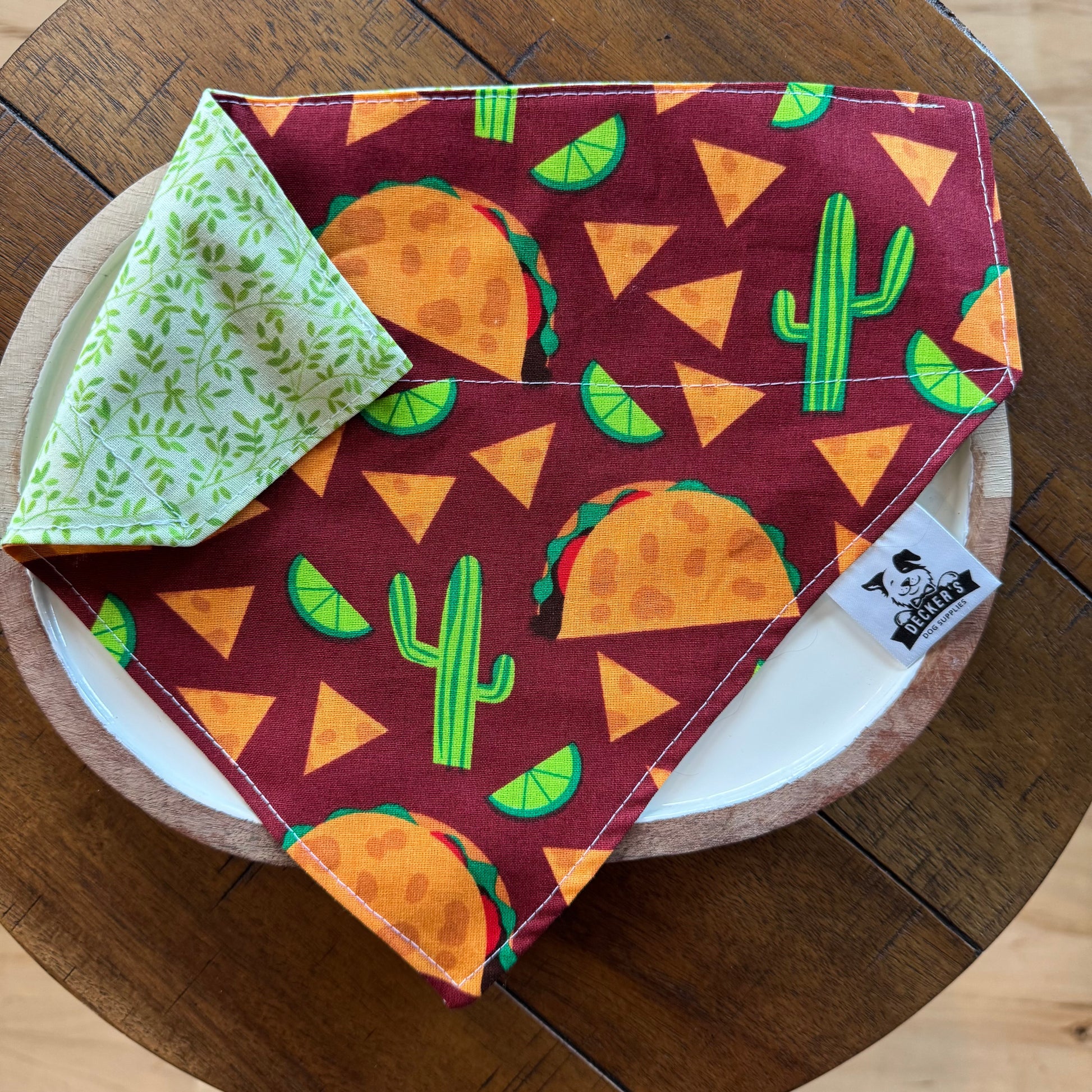 A mix of Tacos, Tortilla chips and cactuses on one side with a green floral print on the other! Great for Cinco De Mayo.