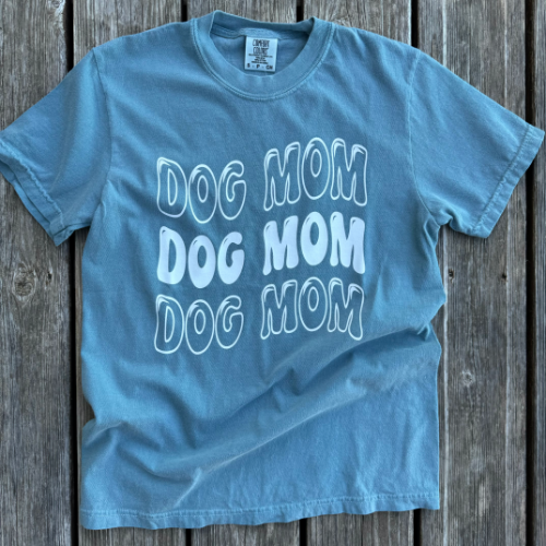 A new fall color-way for some classic DDs designs. Our Dog Mom design in White on an Ice Blue Comfort Colors T-shirt. Perfect fall vibes!
