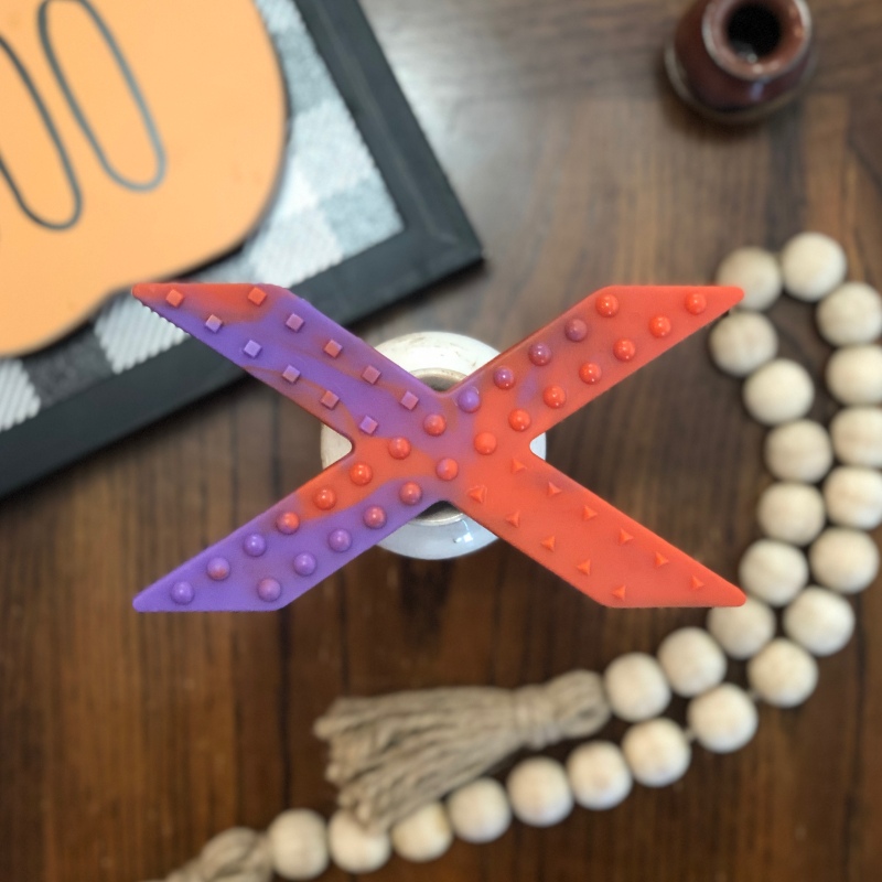 A new Tie Dye twist to a DDS classic. A mix of purple and orange in a unique colorful design. The BarX chew is a heavy chewers favorite, BPA Free, Chicken flavored, and extremely durable!